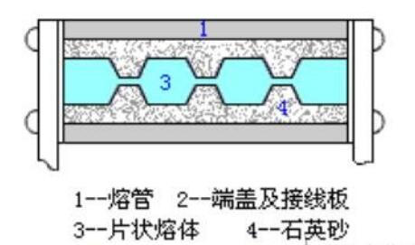 另外一種如下圖所示。熔體裝在有絕緣砂粒填料(如石英砂)的熔管內(nèi),在熔體斷開電路產(chǎn)生電弧時,絕緣砂粒可吸收電弧能量,金屬蒸氣能散發(fā)到砂粒的縫隙中,熔體很快冷卻,從而達到滅弧的目的。